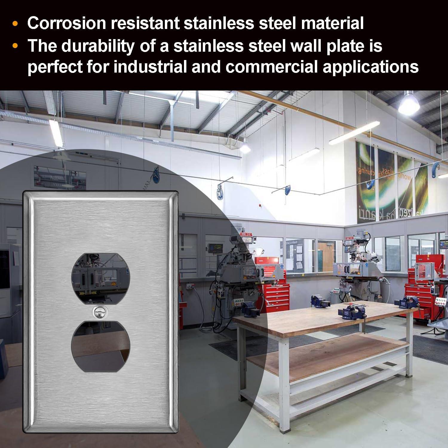 Application: Perfect for commercial and industrial areas. 1 gang oversize duplex stainless steel metal outlet cover
