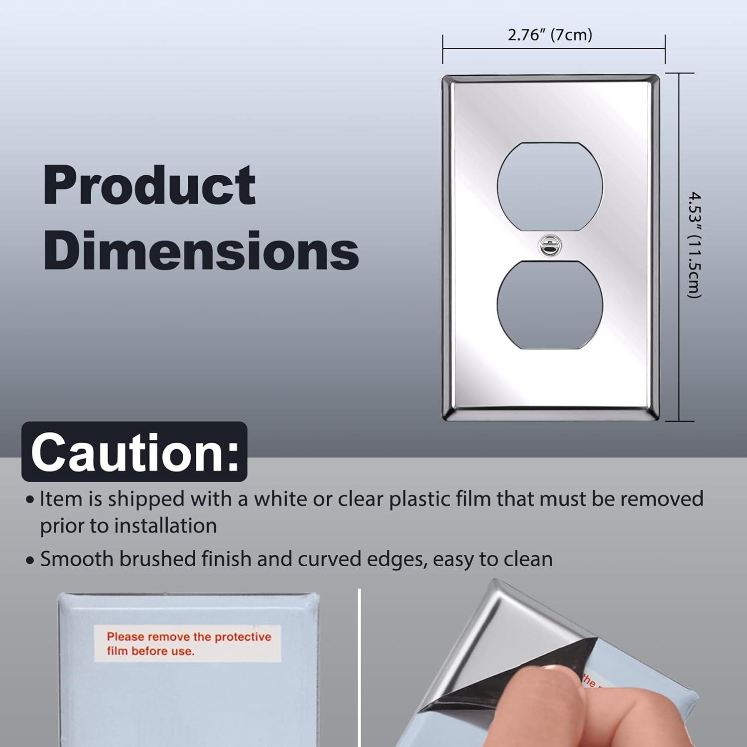 Features: Smooth brushed finish with round curved edges, easy to clean. Specifications: H4.53” x W2.76” x D0.2”, 1-gang standard size wallplate, silver, matching color screws included