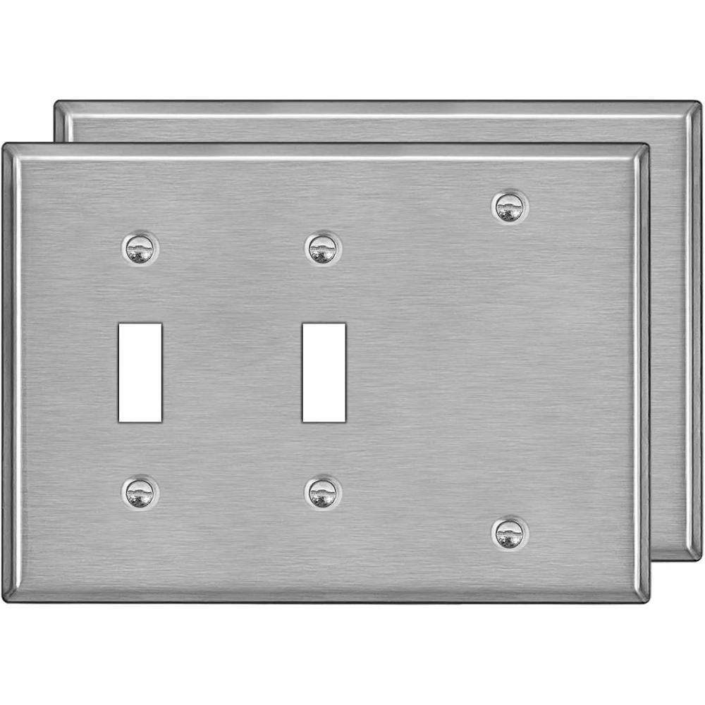 Features: Smooth brushed finish with curved edges, easy to clean. Specifications: H4.53” x W6.38” x D0.18”, 3-gang standard size, double toggle and single blank, silver, matching screws included