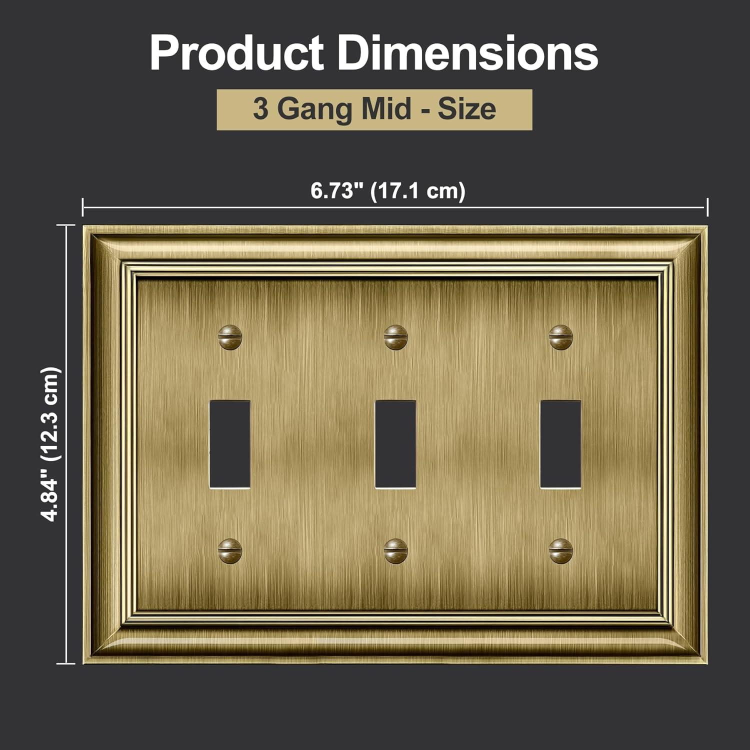 BESTTEN Polished Brass Double Duplex Electrical Receptacle Outlet Cover Plates, 2-Gang Metal Wall Plate Switch Covers, Midsize(3Gang Toggle 1PK)
